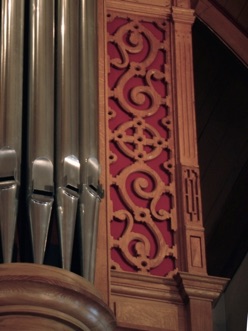 Twee panelen met snijwerk afkomstig van een orgel uit 1904 van de firma Maarschalkerweerd & Zoon (oorspronkelijk gebouwd voor het St. Elisabethgesticht in Amsterdam) konden uit de voorraad van de firma Adema worden overgenomen. De panelen, in een Duitse (neo-) renaissancestijl, werden in het nieuwe front opgenomen op de plaats van de voorheen loze zijvelden. De vorm en detaillering van de nieuw gemaakte torens, kappen en lofwerk zijn dan ook geheel afgeleid van deze Maarschalkerweerd-panelen. De opengewerkte panelen werden aan de achterzijde opnieuw voorzien van rood doek. De kast is vervaardigd uit Slavonisch eiken, gebeitst, gelakt en in de was gezet. De kleur sluit aan bij het overige kerkmeubilair.